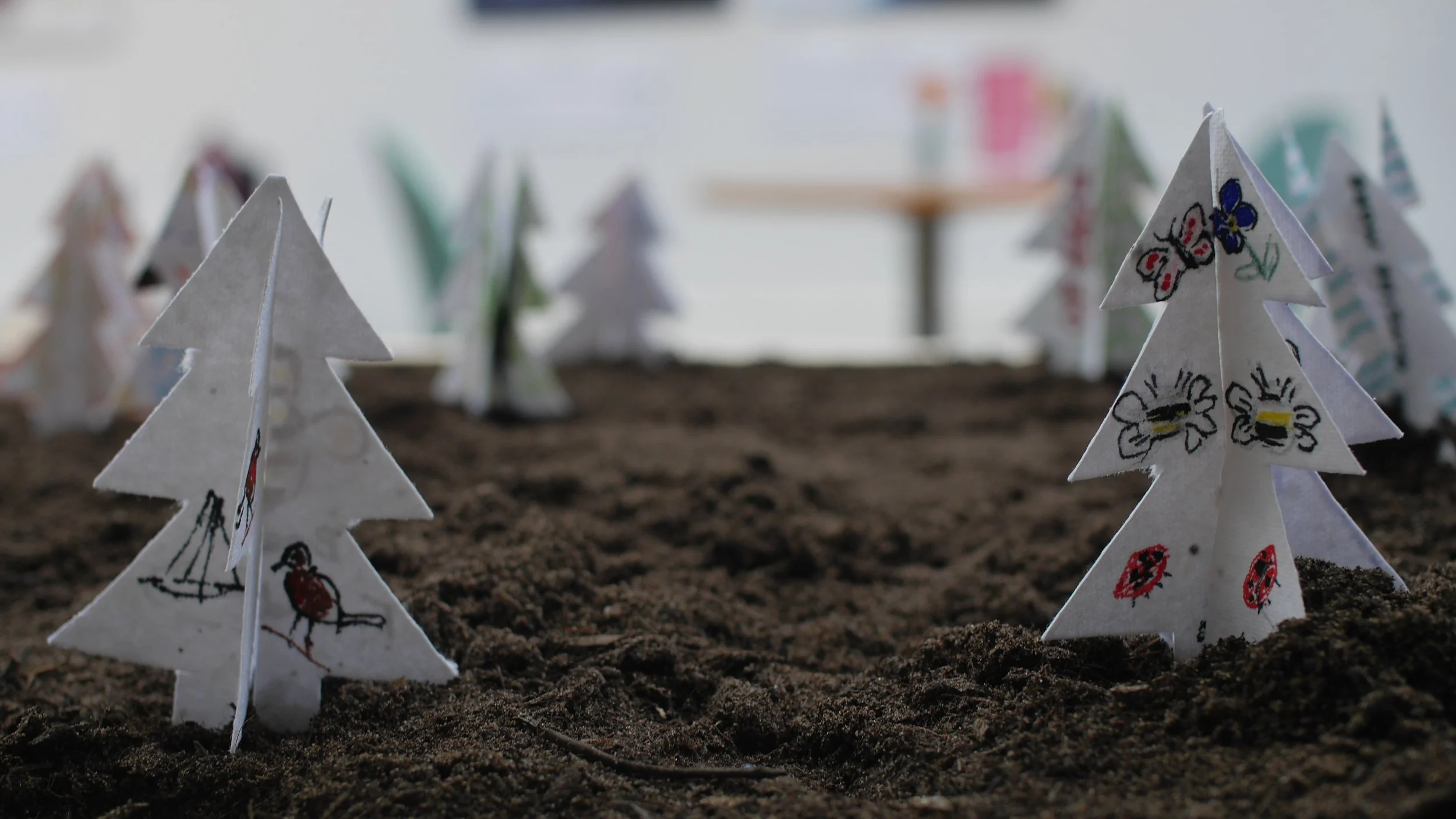 Join our new play artists in residence, emma + pj on Saturday 24 September for the first of their inspiring activities this season here at The Spring. In celebration of Big Green Week, emma + pj will be inviting our community to consider the place of nature in our daily lives, and to join together in the communal, playful act of building an indoor ecosystem together. Starting with bare soil and trees made out of seed paper, we are encouraged to personalise our trees with designs and messages for the future, before planting the miniature trees in the Future Forest installation. Inside each tree are wildflower seeds that will be replanted across Havant, taking the installation back outside, and propagating future ecosystems. All materials used within the installation will be recycled or planted.